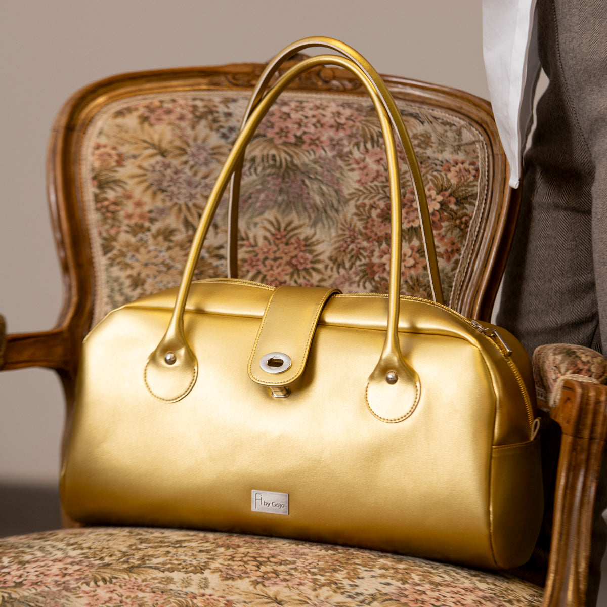 Available in golden, brown, and shimmering light blue colour. Spacious, timeless, and just distinctive enough to become your everyday companion.